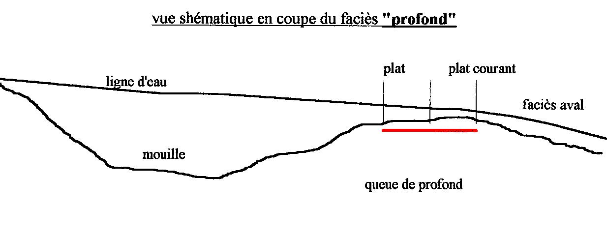 Les zones propices au fraie des Salmonidés se situent généralement dans les queues de profonds, les plats et plats courants précédant les ruptures de pente et les secteurs de tresse. Des faciès en escalier peuvent également être utilisés si la granulométrie y est favorable