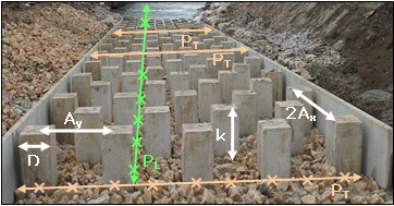 - au niveau de 2 positions X : au centre des espaces inter-blocs (vitesses débitantes) et à mi-distance entre les rangées de blocs, dans l'axe médian du passage inter-bloc (proche des vitesses maximales des jets ; la position exacte du maximum pouvant varier)