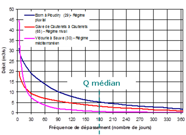 Cette courbe permet de fournir pour un certaines valeurs de débits des pourcentages de temps de dépassement et constitue par conséquent un outil d’évaluation du potentiel de production pour un aménagement hydroélectrique