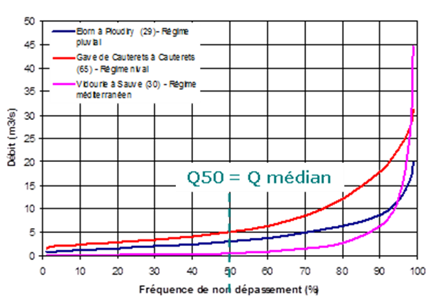 A partir de la courbe de débits classés, on peut approcher les valeurs de débits de crue et d’étiage :