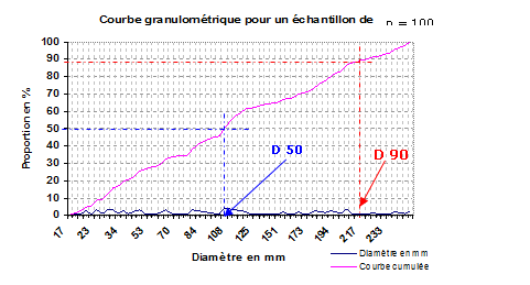 Il est par la suite possible de classer les diamètres du substrat observé afin d’établir une courbe granulométrique. A partir de la courbe cumulée des diamètres des éléments du substrat, il est alors possible de déterminer le D90, diamètre au-dessous duquel on trouve 90 % des éléments, ou le D50, diamètre médian (Diamètres utilisés pour caractériser le transport solide) |